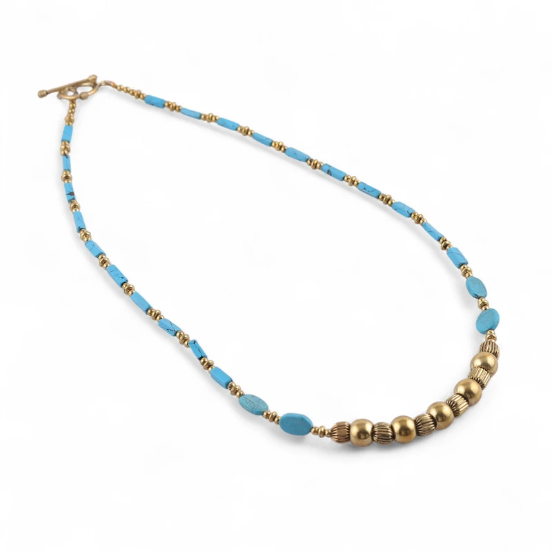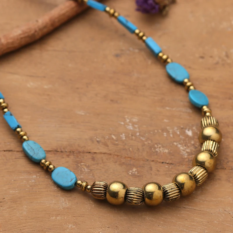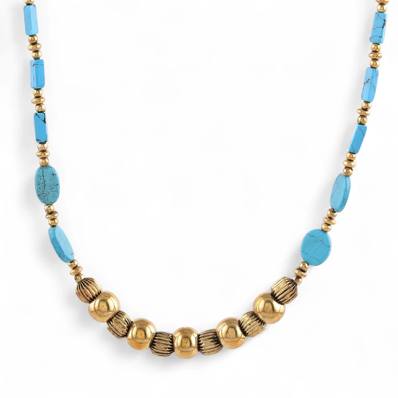 Vibrant Stones and Dynamic Texture The upper portion of the necklace is composed of smooth, tumbled stones in a brilliant sky-blue shade. These oval and rectangular beads feature natural, dark veining that highlights their organic origin, ensuring each stone is visually unique. Separated by petite golden spacers, the blue stones provide a continuous flow of color that draws the eye toward the necklace’s impressive centerpiece.