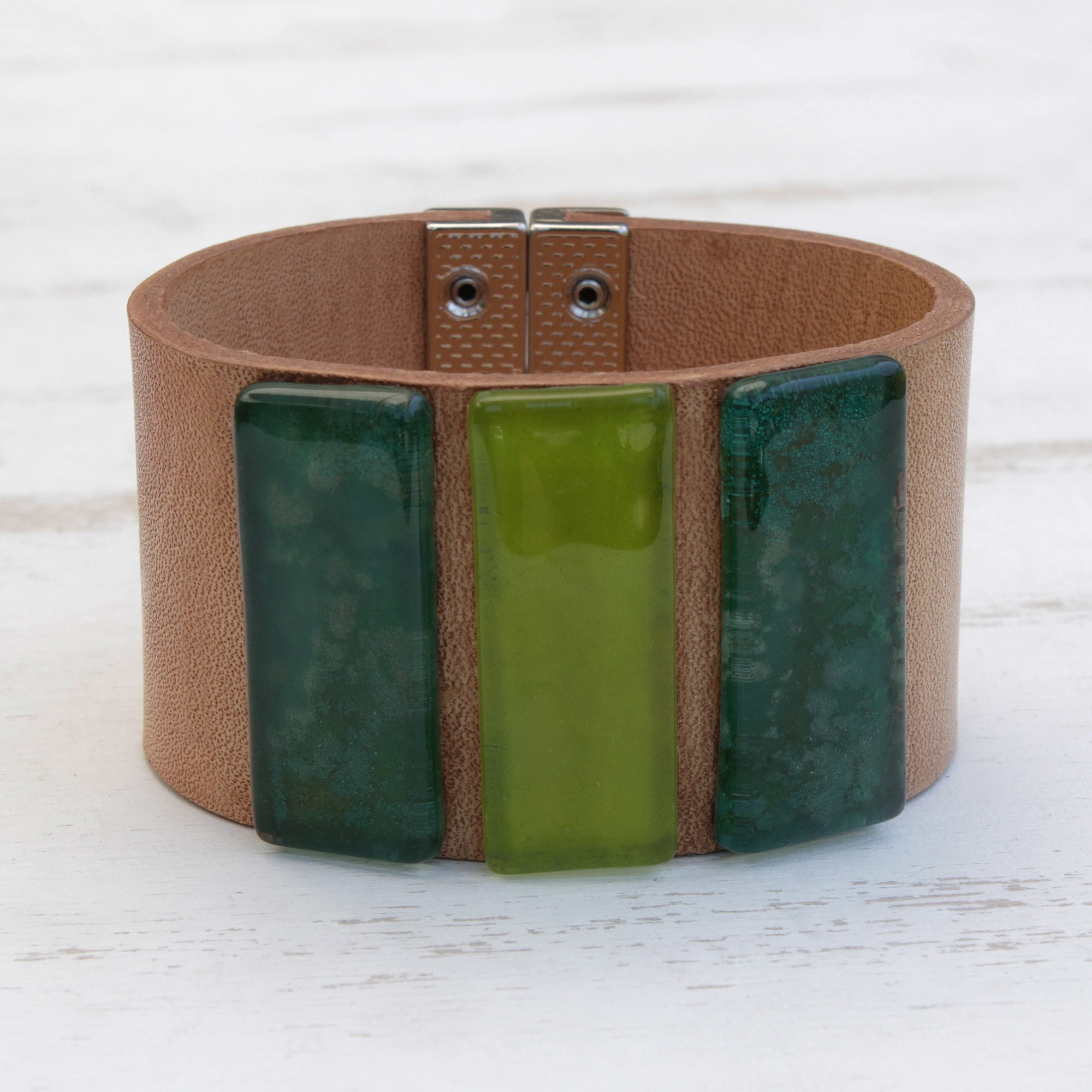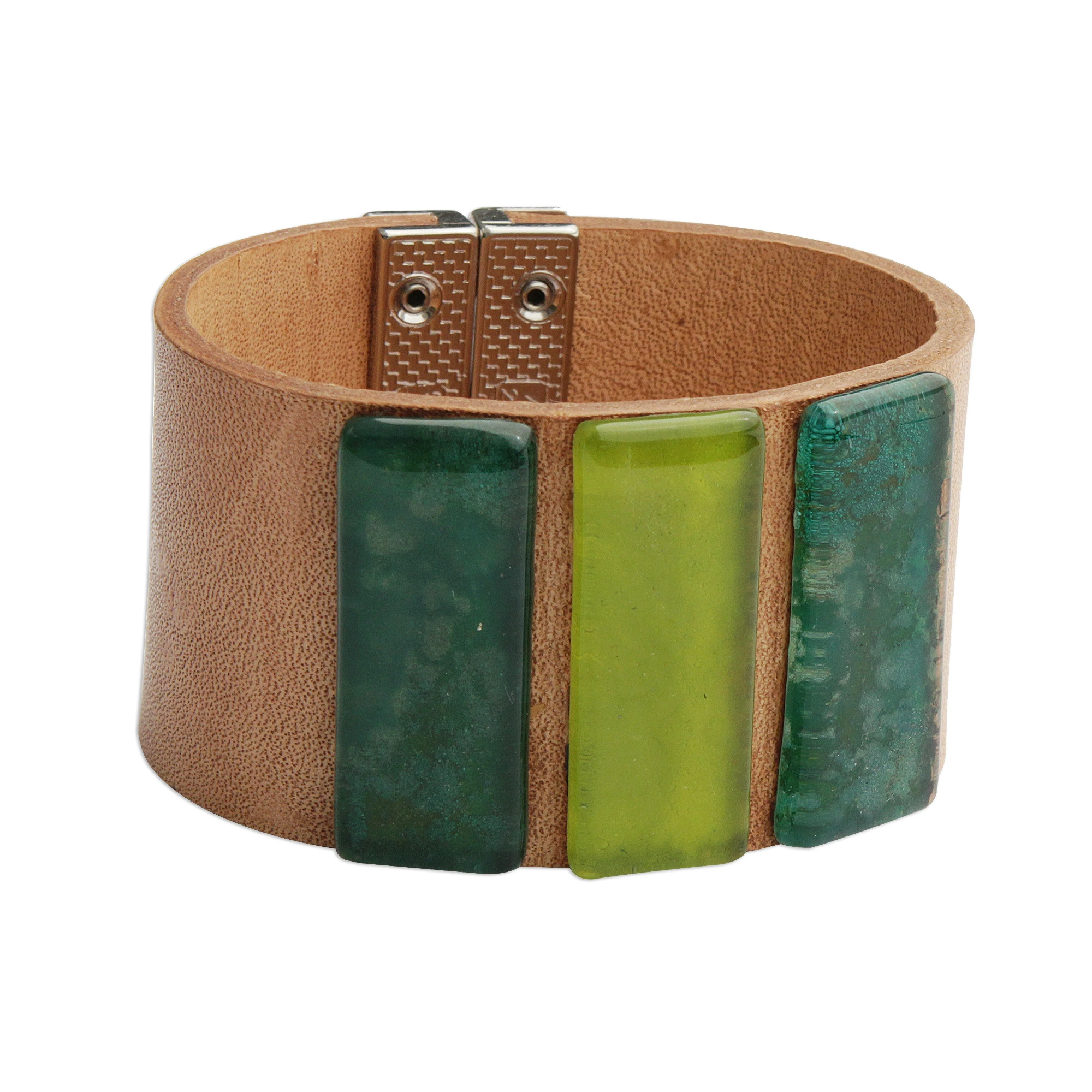 Artisanal Glass and Natural Leather The centerpiece of this design is the trio of hand-finished glass rectangles. Each tile is carefully crafted to showcase a unique shade of green—evoking the varied foliage of a lush canopy—from deep emerald and vibrant lime to a textured, shimmering seafoam. These luminous inserts are flush-mounted on a wide, natural-grain leather band that has been tanned to a soft, sandy hue, providing a warm, neutral backdrop that allows the colors to glow.